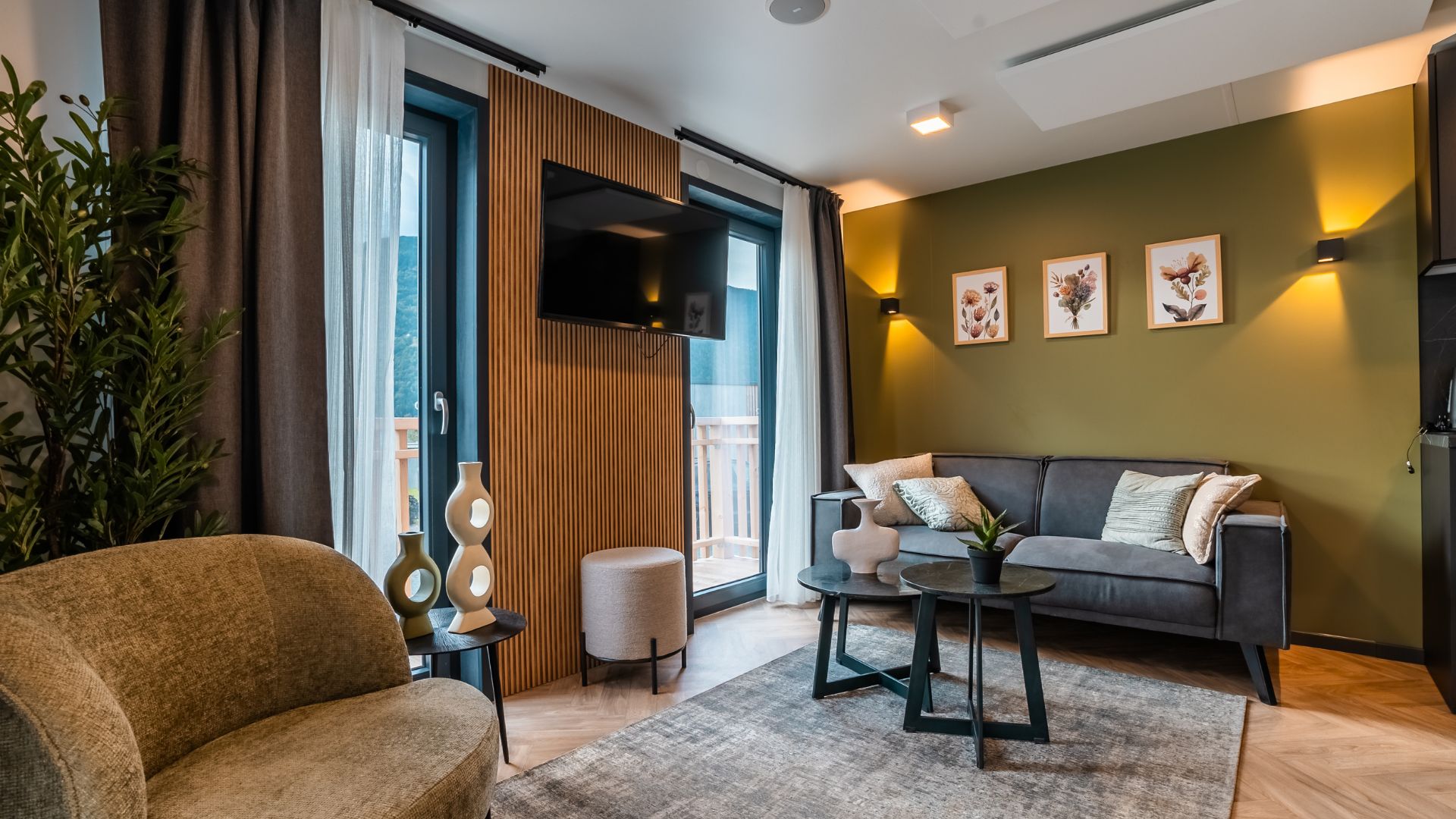 Seerose - Het vakantieverblijf van 9 meter lang, 4,5 meter breed en 3,5 meter hoog oogt en voelt bij de eerste indruk al als thuis. De kleur antraciet versterkt de kwaliteitsrijke uitstraling van deze 2-persoons vakantieverblijf nog meer, net als de houtlookelementen die aansluiten bij de bosrijke omgeving. Het terras, waar u vanuit de living zo opstapt dankzij de schuifdeuren, staat verder garant voor een mooi uitzicht over de Ossiacher See en de omringende bergflanken. Dit terras, dat rondom de vakantiewoning wordt gebouwd, is gemaakt van geïmpregneerd dennenhout.