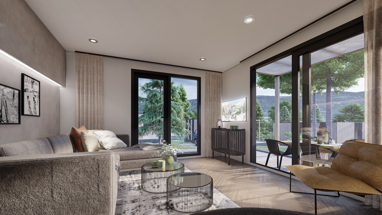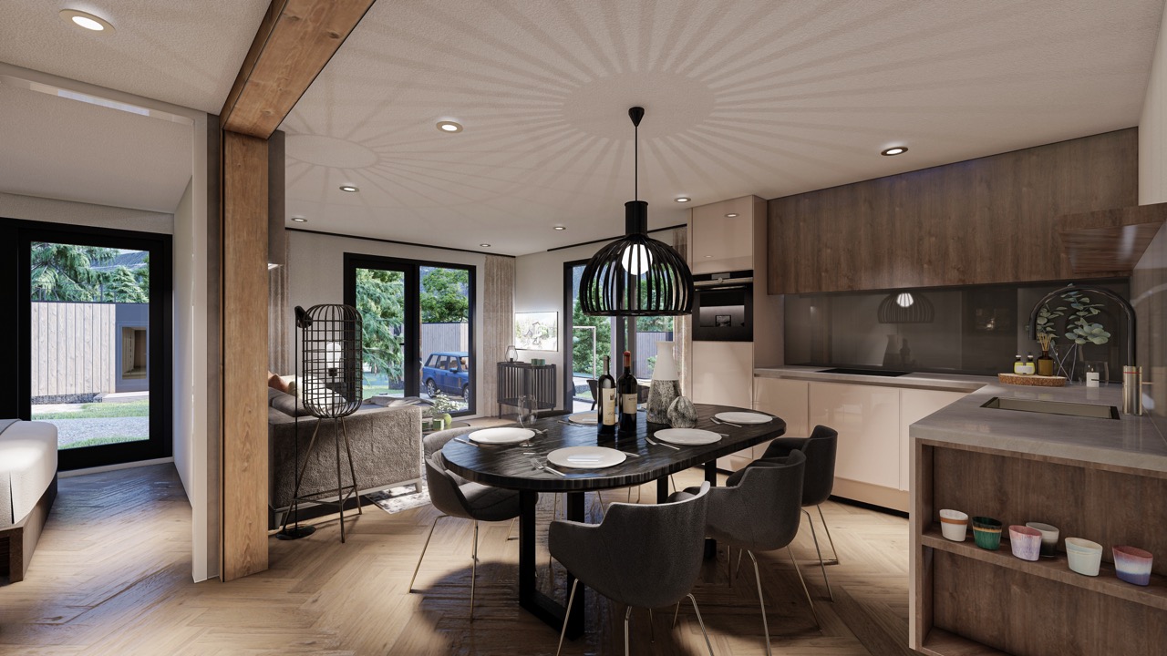 Wulfenia 6 - Deze vakantiewoning van 8,9 meter lang, 6,8 meter breed en 3,5 meter hoog oogt en voelt bij de eerste indruk al als thuis. De kleur antraciet versterkt de kwaliteitsrijke uitstraling van deze 6-persoons vakantiewoning nog meer, net als de houtlookelementen die aansluiten bij de bosrijke omgeving. Het terras, waar u vanuit de living zo opstapt dankzij de schuifdeuren, staat verder garant voor een mooi uitzicht over de Pressegger See en de omringende bergflanken. Dit terras, dat rondom de vakantiewoning wordt gebouwd, is gemaakt van geïmpregneerd dennenhout, net als het hekwerk en de poort ertoe.